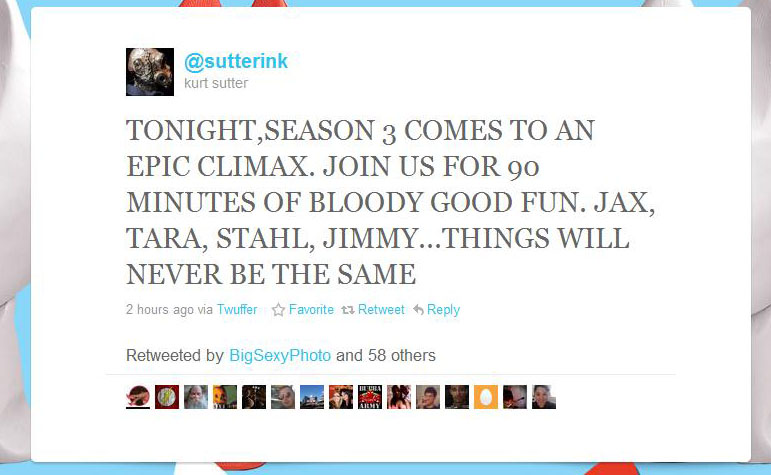 Tonight, the finale to Sons of Anarchy‘s third season airs on FX. It’s a 90 minute episode that, as you can see, showrunner Kurt Sutter has been hyping on Twitter. The last two Sons finales have been pretty damn great, as have the other extended episodes of the series so I should be filled with a substantial amount of excitement for this one as well.